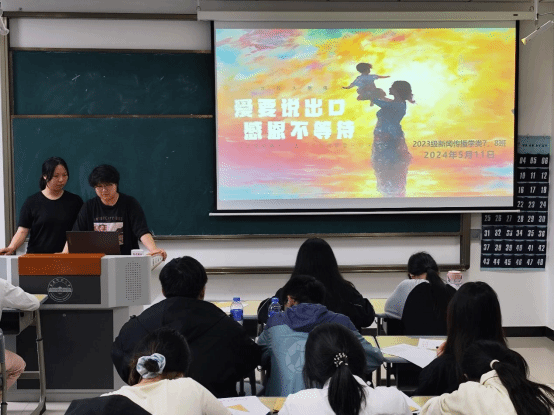 “同學(xué)們,猜一猜明天是什么節(jié)日啊?”“母親節(jié)!”5月11日,新聞傳播學(xué)類專業(yè)2023(7)、(8)班在K202教室開展以“愛要說出口,感恩不等待”為主題的團建活動。活動開始前,活動負(fù)責(zé)人、新聞傳播學(xué)類專業(yè)2023(7)、(8)班的班長楊雨霏、朱研溪提前為每位同學(xué)準(zhǔn)備好信紙和信封。朱研溪說:“我們希望通過寫信這種傳統(tǒng)而深情的溝通方式,讓同學(xué)們勇敢表達自己的心聲,將對母親的愛訴說于筆尖。”學(xué)生們觀看一段關(guān)于母愛的感人短片后,...